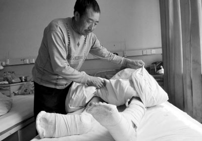 高煥東醫(yī)生告訴記者,小陳的腰1、2、4節(jié)椎體壓縮性骨折,左小腿粉碎性骨折,右足3、4、5節(jié)蹠骨骨折,右跟骨骨折,現(xiàn)在還在進一步治療恢復中。而小陳的父親告訴記者,目前已花了5萬多元錢,向親戚朋友借遍了錢,已經無力繼續(xù)治療了,只能提前出院。