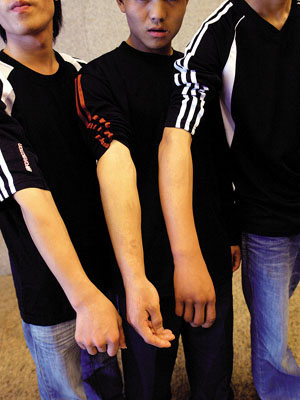 前天,小羌他們?nèi)死鹨滦,向記者展示了右手前?見左圖)。從表面上看,手臂上沒有傷口,但就感覺比他們的左手要腫,而且有些不協(xié)調(diào)的彎曲。小鵬和小田說,他們的手臂至今還在疼痛。