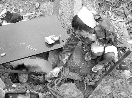 廢墟里,一個少年被扭曲的鋼筋、預(yù)制板埋著,眼神里流露出對生的渴望;廢墟外,一名穿涼鞋的女護士,左手提著一袋血漿,右手和少年的左手緊緊握在一起。地震中,這張照片被網(wǎng)友們稱為“汶川大地震中最感人的十大鏡頭”,照片中的女護士顧云仙,被網(wǎng)友們稱為“最美女護士”。