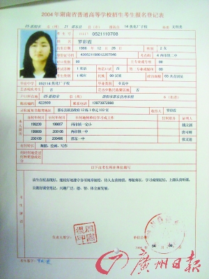 記者昨日查閱假羅彩霞當年被錄取的紙質(zhì)檔案。這份編號為“520821102”的《湖南省2004年普通高等學(xué)校錄取新生名冊》上,“羅彩霞”的考生號為“04430521110708”,批次為“第二批”,錄取形式為:“計劃:國家任務(wù)定向”,上面還有羅彩霞的身份證號等考生基本信息。這份新生名冊的左下方加蓋了“湖南省普通高校招生委員會錄取專用章”的大紅印章。黃開烈說:“我們不能隨便懷疑這個考生是假的。我們每年招6000多名學(xué)生,每個都去懷疑是不可能的。造成假羅彩霞事件的本質(zhì)問題和根源問題不在貴州師大。他們造假能做到這一步,也是我們無法想象的!(文/圖 特派貴陽記者文遠竹)