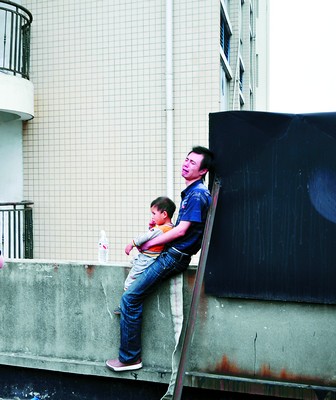 昨日下午4時(shí)20分左右,在郴州市西街一樓房的頂層,一名男子抱著自己3歲的小孩,吵著要從上面跳下來(lái)。