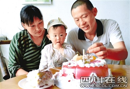 “祝你生日快樂……”昨日下午,成都龍泉西河鎮(zhèn)一農(nóng)家小院里,在去年地震當天出生的小男孩何震生迎來1歲生日,左鄰右舍紛紛前來道賀。小震生“咯咯”地笑著,一刻也閑不住,用胖嘟嘟的小手到處亂抓。