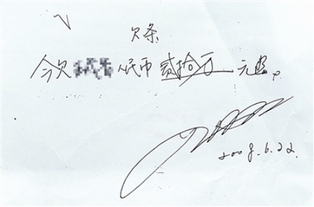 拿到錢后,雅暉寫了張欠條:“今欠老婆人民幣二十萬!背_始沒有細看,隔了兩天,又覺得不妥,找了個合適的機會提醒了雅暉一下,“他把老婆改成了我的名字,但是簽名是用的藝術簽名,一共有8條弧線,我實在沒認出來,不過我想以后都快是夫妻了,還計較這些干什么呢?”