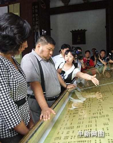 今天,聽說毛澤東的孫子要回來尋根了,老老少少的清漾村村民早就等在了村口,村中的喇叭更是唱起了《北京有個(gè)金太陽》等革命經(jīng)典老歌。在熱烈的氣氛中,毛新宇夫婦走下了車子,他們親切地向村民微笑示意,舉手投足間流露出了對這片土地特有的感情。在群眾的簇?fù)硐,毛新宇夫婦邁進(jìn)了清漾祖宅大門。在合敬堂里,他們饒有興趣地翻閱了《清漾毛氏族譜》,并且聆聽了江南毛氏衍脈和族譜的介紹,當(dāng)?shù)弥约菏墙厦系?8代嫡孫時(shí),毛新宇不住微微頷首。