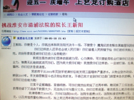淮安市民曹先生在打官司勝訴后,卻遭遇執(zhí)行難的問題。于是他一氣之下在網(wǎng)上發(fā)帖,將自己從打官司到執(zhí)行遇到的難題公布在網(wǎng)上,并向?qū)徖碓摪傅幕窗彩星迤謪^(qū)法院王新陽院長公開挑戰(zhàn),要求院長出面對話。誰料想該帖一經(jīng)發(fā)出立即引起網(wǎng)友關(guān)注,國內(nèi)一些網(wǎng)站也紛紛轉(zhuǎn)載。一時(shí)間,他本人與王新陽都被推至輿論的風(fēng)口浪尖。昨天,曹先生在電話里告訴記者:“事與愿違,現(xiàn)在事情發(fā)展到我自己也控制不住的地步”,而王院長在接受記者采訪時(shí)表示,他可以理解曹先生發(fā)帖時(shí)的心情。