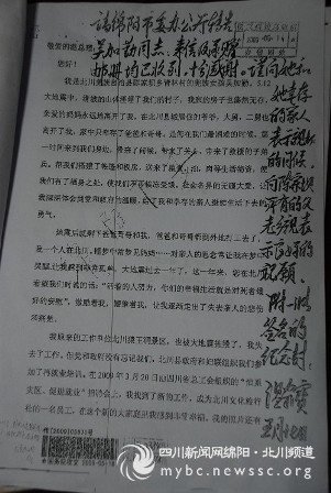 “請綿陽市委辦公廳轉(zhuǎn)告吳加勤同志,來信及承贈郵冊均已收到,十分感謝。謹向她和她幸存的家人表示親切的問候,向陳家壩所有的父老鄉(xiāng)親表示良好的祝愿。附一簽名的紀(jì)念封。溫家寶 五月十七日”。(楊亦萱)