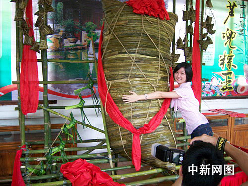 這個端午節(jié)小黃金周,在嶺南最大的古典私家園林中山詹園里,游客可以親自見證1.88米高的巨無霸蘆兜粽。該巨無霸大粽子由中山傳統(tǒng)裹粽大師,用了三天時間,動用數(shù)百斤包括糯米、紅綠豆、豬肉等材料制作而成。5月26日,1.88米巨型蘆兜粽現(xiàn)身在詹園!斑沒見過這么大的粽子!”游客劉先生驚訝地說。目見如此龐大的巨粽,游客們都紛紛爭先上前留影。