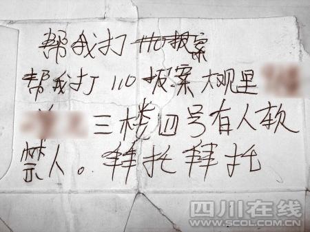 “幫我打110報(bào)案……有人軟禁人,拜托拜托!弊蛉障挛2點(diǎn),家住成都大觀里某小區(qū)的一位大爺正在小區(qū)內(nèi)散步,突然,一張硬紙條歪歪扭扭地從三樓窗戶飄落下來,大爺拾起一看,大吃一驚,立即將紙條交給小區(qū)門衛(wèi)。5名警察接警后立即出動(dòng)……