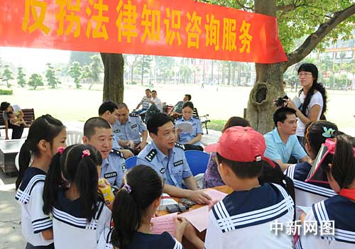 在北部灣廣場,北海市公安局擺設的“反拐”法律知識咨詢服務臺前,一群小朋友把桌子團團圍住,就有關防拐知識認真的向民警咨詢起來。小朋友的問題貼近實際,民警的回答則詳細易懂。通過交流,民警將一些易于操作、實際效果明顯的反拐知識教授給小朋友們。