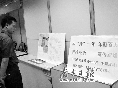 招牌有兩塊,一塊寫著“賣‘身’一年,年薪百萬。3天內(nèi)資金要到30萬,謝謝支持!”的字樣,并粘貼著賣身者蔡開仕的聯(lián)系方式。另一塊則粘貼著整版的某媒體關于“騎行亞洲、宣傳亞運”活動的報道。