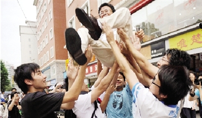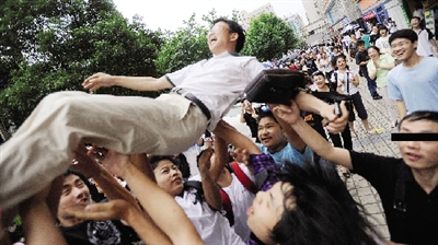 高考最后一門英語結(jié)束了,對(duì)緊繃的高三學(xué)生來說,這是一個(gè)歡樂的時(shí)刻,輕松的時(shí)刻。周南中學(xué)十幾名高三學(xué)生,剛走出長(zhǎng)沙一中考點(diǎn),便將班主任吳老師舉起拋向了空中。