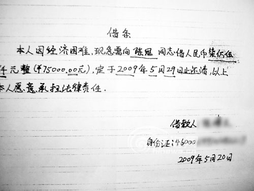 一會(huì),小鋒看到阿東將他的朋友阿冠從另一個(gè)包廂里請(qǐng)進(jìn)來(lái)!靶⌒值埽铱梢越杞o你3.5萬(wàn)元,但10天后你要還給我7.5萬(wàn)。”阿冠拍了拍小鋒的肩膀,小鋒左右為難,想拒絕,但是又害怕對(duì)方不讓自己離開(kāi)。 “好,我同意!眲e無(wú)選擇的小鋒咬了咬牙,他按照對(duì)方所念的話寫(xiě)下了借條。為取信于小鋒,阿冠還當(dāng)面將3.5萬(wàn)元付給阿東。