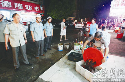 50余名城管執(zhí)法隊(duì)員整裝肅立一旁,幾桌食客原本旁若無人地大吃大喝,最終抵擋不住,將占道的餐桌搬進(jìn)了店內(nèi)。前晚,記者隨洪山城管執(zhí)法大隊(duì)參與占道夜市排檔的整治,看到如此有趣一幕。