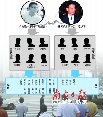 許建強(qiáng)為首成立了“閘坡鴻發(fā)水產(chǎn)品購(gòu)銷部”等一系列公司,以暴力、脅迫等手段實(shí)施故意殺人、故意傷害、敲詐勒索、強(qiáng)迫交易和非法收取保護(hù)費(fèi)等違法犯罪行為,壟斷了陽(yáng)江部分地區(qū)的海鮮、冰條、螺仔、三鳥(niǎo)、沙石、煤氣、客運(yùn)、運(yùn)輸物流市場(chǎng)。林國(guó)欽為首則成立了信誠(chéng)寄賣行等一系列公司,同樣以暴力、脅迫手段實(shí)施了故意傷害、強(qiáng)迫交易、非法經(jīng)營(yíng)等違法犯罪活動(dòng),基本壟斷了陽(yáng)江的水泥銷售市場(chǎng),在追收非法債務(wù)過(guò)程中,逼迫他人以山林、廠房抵債,大肆掠奪他人或企業(yè)財(cái)產(chǎn),甚至導(dǎo)致有的企業(yè)破產(chǎn)倒閉。陽(yáng)江地區(qū)的社會(huì)穩(wěn)定及經(jīng)濟(jì)發(fā)展受到了嚴(yán)重影響。
