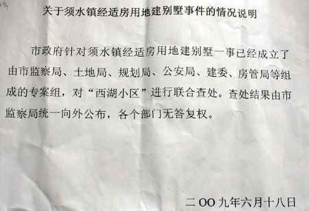 在落款時(shí)間為2009年6月18日的“關(guān)于須水鎮(zhèn)經(jīng)適房用地建別墅事件的情況說明”中顯示:“市政府針對(duì)須水鎮(zhèn)經(jīng)適房用地建別墅一事已經(jīng)成立了由市監(jiān)察局、土地局、規(guī)劃局、公安局、建委、房管局等組成的專案組,對(duì)“西湖小區(qū)”進(jìn)行聯(lián)合查處。查處結(jié)果由市監(jiān)察局統(tǒng)一向外公布,各個(gè)部門無答復(fù)權(quán)。”