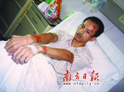 昨日下午,記者趕到三水區(qū)人民醫(yī)院住院部,傷者韋奕慶正躺在病床上打吊針,他鼻子里插著氧氣管,左額、太陽穴、眼角及下巴等多處涂著紫藥水。