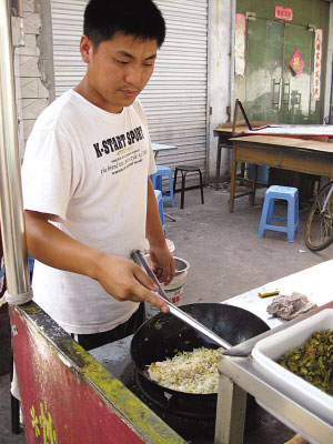 鮑斌是揚大體育學院03級學生,因為家庭經濟困難,讀大三的時候,小鮑決定休學創(chuàng)業(yè),選擇的創(chuàng)業(yè)項目是再普通不過的蛋炒飯。他沒有向父母透露半點風聲。在外面租了一間房子,開始了創(chuàng)業(yè)歷程。開始,小鮑的生意不是很景氣,后來,大伙對他的手藝認可后,生意便開始紅火起來!拔颐刻鞙蕚涞某达埗紩葎e人賣得快,所以經常早收攤,算下來,平均一天能賣幾百盒!滨U斌一臉興奮地告訴記者,刨去成本、平常的開銷,每年掙10萬元非常輕松。因為生意越來越火,他給淮安老家的父親打了個電話,請二老過來幫忙。從此兩個老人正式給兒子打起“下手”來。