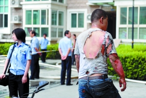 約十多分鐘后,男子跟著小姜走出地下室。此時(shí),男子渾身漆黑,手臂、背部等被燒傷,衣服破了一個(gè)大洞。