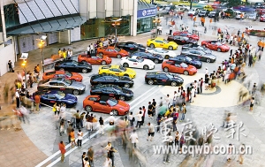 “我長(zhǎng)這么大,還從來(lái)沒(méi)有一次看到這么多名貴的豪車(chē)。”昨下午,市民許小姐逛街經(jīng)過(guò)江北觀音橋步行街遠(yuǎn)東百貨,門(mén)前廣場(chǎng)的一幕讓她差點(diǎn)合不攏嘴:23臺(tái)總價(jià)接近億元的法拉利、瑪莎拉蒂豪華跑車(chē)發(fā)動(dòng)機(jī)低鳴,然后依次停放在她的面前。