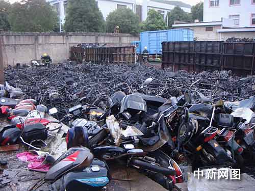 中新網(wǎng)寧波7月8日電(何蔣勇 歐陽峰)7日下午5時50分許,位于浙江省寧?h興寧中路45號的寧?h物資再生利用有限公司發(fā)生一起火災,濃煙沖天達百余米高,整個寧海縣城都能清楚地看到黑煙滾滾。當?shù)叵啦块T先后出動四輛消防車、近四十余名官兵參與火災撲救,約40分鐘后成功將大火撲滅,但是該公司露天堆場內(nèi)近百輛廢舊摩托車被大火燒成骨架。