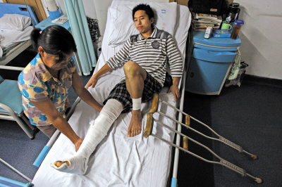 昨日下午,23歲的綦江男子楊傳華躺在重醫(yī)附一院骨科病床上,他的右腿打著夾板、纏著繃帶不能動彈。他說,7月2日早上,他在渝中區(qū)六店子小學(xué)旁邊的樹林里鍛煉,學(xué)校保安誤認(rèn)為他是兩天前騷擾學(xué)校女老師的男子,將其腿打斷。至今,學(xué)校和保安未支付一分治療費(fèi)用,也沒有來看望和向楊道歉。