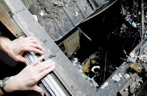 隨后,記者進(jìn)入金湯大廈三樓,從電梯間窗戶看下去,正對(duì)死者墜樓砸穿庫房的屋頂,可以看到此處垃圾較厚,全堆在屋頂上,中間被砸出一個(gè)大洞,垃圾的酸臭味很刺鼻。三樓外墻上一根鐵皮煙道被砸壞。