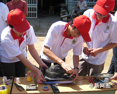 7月9日,我們無線電協(xié)會的成員又在這里當(dāng)起了義務(wù)維修工。起初,只是有不少群眾圍觀,并沒有人拿來舊電器要修理。他們有些遲疑:這群孩子,能修好嗎?過了好大一會兒,一位大嬸拿來了一個電飯鍋,我們趕緊接了過來。由于沒有專業(yè)人員修理,電飯鍋已經(jīng)好久不能用了。最終,我們憑借過硬的技術(shù)贏得了大嬸的贊揚,同時也讓圍觀的人少了份猶豫,多了份信任。大家開始爭先恐后地拿來自己家里有問題的電視機、電風(fēng)扇要我們幫忙修理!雖然烈日當(dāng)空,我們卻忙得不亦樂乎,連汗都顧不上擦!“看到鄉(xiāng)親們拿著修好的電器喜笑顏開的樣子,我打心眼里高興!希望以后能為更多的鄉(xiāng)親服務(wù)!”一位隊員高興地表示。在一天的義務(wù)維修中,隊員們充分調(diào)動了自己的專業(yè)知識,積極聯(lián)系實際,提高自己動手能力的同時又服務(wù)了鄉(xiāng)親。