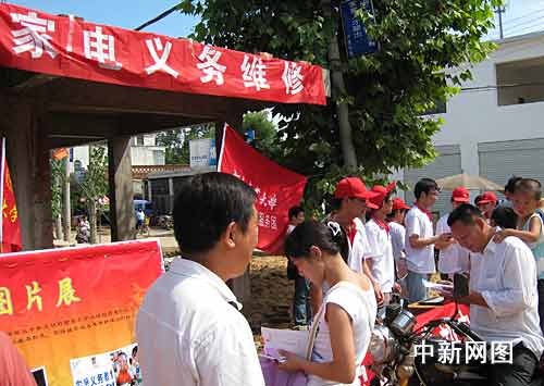 原本就熙熙攘攘的農(nóng)貿(mào)市場,這幾天更是熱鬧非凡,原來是河南農(nóng)大的學(xué)生在這里設(shè)立了科技興農(nóng)服務(wù)臺!敖▏60周年成就圖片展”、免費發(fā)放科普手冊及科技光盤、義務(wù)維修家用電器等形式多樣的服務(wù)活動將在這里一一上演。臨行前,王建忠老師一再囑咐我們:本次活動作為我們對建國60周年的獻(xiàn)禮,大家一定要傾盡所學(xué),為三農(nóng)服務(wù)。