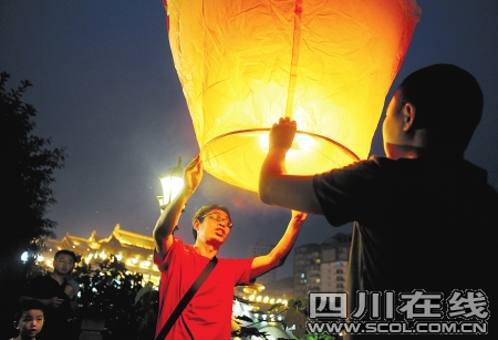 晚8點,合江亭邊天色還未全暗,“范跑跑”身著紅色T恤、休閑短褲和一群藝術家安靜地坐在竹椅上等候。8點30分左右,德籍華人藝術家蔡青招呼眾人,《祈愿》正式開始,范跑跑徑直走向安放孔明燈的紙箱旁!拔覀兊目酌鳠羰菑呐_北郵購過來的。除了要用孔明燈為地震逝者祈愿,還寓意海峽兩岸人對生命的尊敬。下面我和范老師將共同放飛孔明燈,愿意參與的市民都可以加入。”蔡青是此次活動的主要發(fā)起人,作為常年旅居國外的德籍華人藝術家,蔡青說多次前往映秀、北川等災區(qū),大片廢墟令他很震驚。蔡青點燃孔明燈后,邀請“范跑跑”和他共同扶住燈的底框,將高達1米左右的孔明燈逐個放飛。