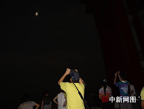 從21晚10時開始,陸續(xù)有民眾登上當(dāng)?shù)刂包c鳳凰山,等候日全食。22日7時許,記者在鳳凰山上山沿途看見數(shù)以萬計的民眾扶老攜幼,手持X光片、電焊防護鏡、黑色玻璃片、水盆等觀看工具,在鳳凰山上尋找最佳觀看位置。