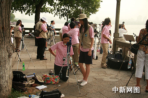 雖然臺灣的天文愛好者都知道天氣情況,但是早晨6時左右,距離日全食還有兩個多小時的時間,在杭州西湖十景之一的平湖秋月處,這批來自寶島臺灣的天文愛好者便早早靜候天文奇觀的到來。