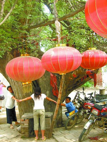 “這棵樹可有年頭!”村民楊更偉說,這棵大槐樹已有一千多年的歷史,樹干周長將近5米,5個成年人才能把這棵大槐樹環(huán)抱住(如圖),偶爾會有人在樹下燒香,樹洞里布滿了蜘蛛網(wǎng),一直沒人管理。