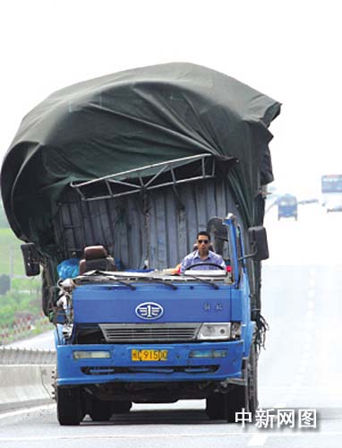 中新網(wǎng)杭州7月27日電(記者 龔讀法 通訊員周銘)在7月25日下午,記者在浙江省杭州市采訪途中發(fā)現(xiàn)非常雷人的一幕:104國(guó)道瓶窯段,一輛閩C牌照的大貨車(chē),滿載貨物急速行駛著,但是仔細(xì)一看,這輛貨車(chē)的駕駛室卻是“敞篷”的。這樣的景象嘆為觀止。