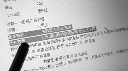 “20—28歲,大專以上學(xué)歷,熟悉影視廣告,具基本文字能力,溝通能力強(qiáng)”,除這些簡(jiǎn)單明了的硬性規(guī)定外,其他規(guī)定讓不少網(wǎng)友 “百思不得其解”,如:其招聘對(duì)象非男非女,而是“外星人”;基本特征則要求:頭腦發(fā)達(dá),四肢簡(jiǎn)單;最吸引眼球的還是那所謂的“優(yōu)先政策”,即:出示精神病院證明者,可免試上崗。