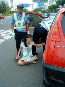 女子見搶不回駕駛證,便開始辱罵交警。這時,現(xiàn)場出現(xiàn)了不少圍觀的市民。就在其他交警拍照取證時,該女子指著一名拍照的交警大聲喝斥“不準拍照”,F(xiàn)場交警見狀,在請示上級后,決定以妨礙執(zhí)法暫扣該女子車輛,并對其進行行政拘留。一看到交警準備拔走車鑰匙,還要拘留她,該女子立即沖回自己車前,坐在地上哭鬧起來。記者留意到,車內(nèi)還有一名約10歲的男孩,男孩被這一情景嚇哭了。