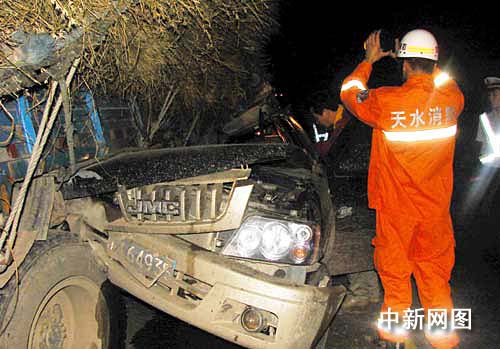 消防官兵到達現(xiàn)場后,發(fā)現(xiàn)一輛車號為川H64935的皮卡車撞進與同向行駛的一輛車號為甘E03749載有秸桿的貨車左側(cè)的后輪胎處,“皮卡”車身嚴重損壞,地面血跡斑斑。車禍致“皮卡”車上一人當場死亡,“皮卡”內(nèi)另有兩名傷者隨即被先行趕到的120急救車送往醫(yī)院救治。