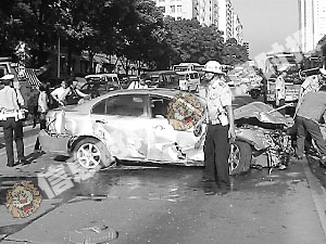 目擊事故的一名女清潔工說,白色小車當(dāng)時的車速很快,突然就徑直撞向路中心護(hù)欄,同時發(fā)出一連串的撞擊響聲!斑@樣猛的撞車,司機(jī)竟然能保住大命,車也沒起火,太幸運了!”