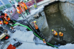 塌陷下方是一處污水井,修污水井須排空污水,F(xiàn)場(chǎng)搶修人員稱,從前晚就開始向外排水,排水集團(tuán)昨日啟動(dòng)數(shù)臺(tái)水泵抽升塌陷現(xiàn)場(chǎng)上游污水,并將污水抽到雨水井。