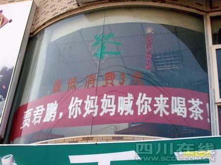 再三追問下,來自重慶農(nóng)村的陳先生如實(shí)說,他平時喜歡上網(wǎng),看到“賈君鵬,你媽媽喊你回家吃飯”這句新的網(wǎng)絡(luò)流行語后,一下子勾起了自己童年的回憶,想起那個時候,每天傍晚,媽媽都要喊他回去吃飯的情景。而前兩天,他在網(wǎng)上看到一張照片,重慶的一家火鍋店竟然掛出一條橫幅,上面寫著:“賈君鵬,你媽媽喊你來吃火鍋!”他頓時靈機(jī)一動:“我為什么不能依葫蘆畫瓢,也掛一個橫幅呢?”“那為什么要寫成‘喝茶’呢?”陳先生說:“我這是茶樓,不管飯也不管吃火鍋,打麻將倒是可以,但總不能寫成‘賈君鵬,你媽媽喊你來打麻將’噻,所以就寫成來喝茶了!敝劣谶@橫幅有沒有給茶樓打廣告的意思,陳先生坦言:“也許有一點(diǎn),但一來估計廣告的效果并不大,二來從自己的本意來說,娛樂的成分還要大過廣告的成分!