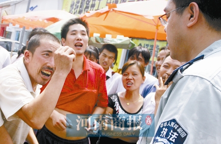 一群持信陽口音的婦女開始指責(zé)城管隊員:“哪有這樣的執(zhí)法人員,上來就搶東西,掀車子!薄拔覀兌际俏拿。別講大道理,我們不懂,我們掙點(diǎn)錢不容易!薄芭驳浇值览镞呑錾,哪有錢賺?”