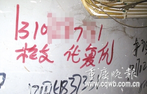 前日上午,記者在彭水縣文化館一居民帶領(lǐng)下,來到該館二樓轉(zhuǎn)彎處,墻上滿是“辦證”、“貸款”等牛皮癬,其中有兩塊內(nèi)容最雷人:“131072×××××,迷藥、槍支”、“131072×××××,槍支、代復仇”(右圖)。