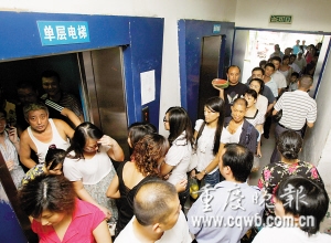 3日晚7時(shí),記者在金島花園E-House大廳發(fā)現(xiàn),單層電梯前已排了20多個(gè)人,因大廳沒(méi)空調(diào),燥熱難當(dāng),部分市民急得大聲罵娘。怕滋生事端,物管派來(lái)幾名保安現(xiàn)場(chǎng)維護(hù)秩序,發(fā)現(xiàn)有插隊(duì)的居民,出面制止。