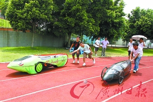 歷經(jīng)暑假兩個(gè)多月打造,外形如一顆黑色子彈、25毫升汽油可跑8000米的概念車“子彈頭”驚艷亮相,近日在華農(nóng)大操場(chǎng)進(jìn)行了性能測(cè)試。這輛車的制作團(tuán)隊(duì)主要由30多名大三大四學(xué)生組成,從制作配件到設(shè)計(jì)安裝全部手工完成。該車全長3.2米,高70厘米,重約20公斤,由一人駕駛,時(shí)速可達(dá)40~50公里,本月下旬將赴上海參加一項(xiàng)節(jié)能車競(jìng)技大賽。