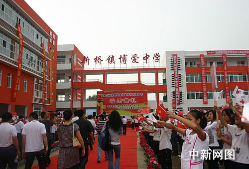 中新網(wǎng)綿陽9月8日電(霍潺)中國航空工業(yè)集團公司通過中國紅基會“中央企業(yè)援助基金”捐資1000萬元人民幣援建的綿陽市游仙區(qū)新橋博愛中學(xué)8日竣工。在紅白相間的新教學(xué)樓前,同學(xué)們揮舞著手中的五星紅旗和中國紅基會會旗,齊聲唱著愛的奉獻,感謝社會的無私關(guān)愛。