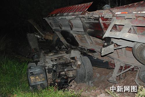 4時(shí)15分,消防隊(duì)員趕到事發(fā)路段,只見(jiàn)大掛車(chē)正翻倒在路旁,由于側(cè)翻時(shí)車(chē)體與地面產(chǎn)生摩擦非常大,掛車(chē)車(chē)頭嚴(yán)重變形,滿(mǎn)載的鋼筋及車(chē)體碎片散落一地,事故現(xiàn)場(chǎng)能清晰的看到一條磨擦印。此時(shí),副駕座上的一男子整個(gè)身體都已被甩出駕駛室外,但是該男子頭部卻被卡在右側(cè)車(chē)窗處,經(jīng)現(xiàn)場(chǎng)救護(hù)醫(yī)生判斷該名人員已沒(méi)有了生命體征,已經(jīng)死亡。