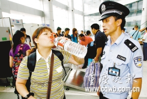 昨日下午2時(shí)許,(重慶市)龍頭寺候車廳檢票處,凡是拿著礦泉水瓶進(jìn)站的乘客,都要先喝一口,然后才能順利進(jìn)站。據(jù)悉,這是重慶鐵路公安處新出臺(tái)的安檢規(guī)定:凡液狀體物品進(jìn)站,一律開(kāi)瓶檢查,而自帶飲料的,則必須親自喝一口。