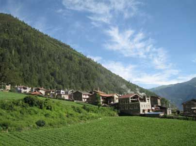 這就是“白菜公主”居住的砍竹村上寨,藍(lán)天、森林、草場、白菜地、石砌藏房,真是世外桃園。該村距317國道僅兩公里,有路況較好的通村公路連接國道,是自駕游理想的目的地。