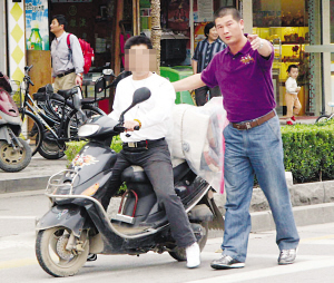 “前面有一輛助力車已經(jīng)騎到快車道上。”便衣一指,記者看到一輛無牌助力車騎行在快車道內(nèi),車上坐著一男一女,男子還從后方抱著女子操控著方向?吹角胺铰房谡局3個(gè)人,騎車男女并沒有在意,就在他們準(zhǔn)備駛離時(shí),便衣迅速上前,在男女一愣 神的工夫已經(jīng)將車控制。緊接著兩名交警上前,這對男女頓時(shí)傻眼了。便衣和交警配合,這一招同樣在北圩路水西門大街路口取得了效果。