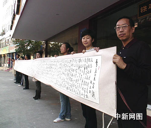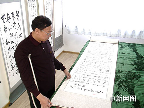 中新網(wǎng)烏魯木齊9月24日電(王小軍)新疆烏魯木齊一殘疾人身殘志堅(jiān),閑暇之余,拿起手中的畫(huà)筆,書(shū)寫(xiě)下一幅13米長(zhǎng)卷,獻(xiàn)給新中國(guó)成立六十周年。