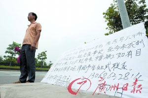 他說(shuō),在兒子出事后的第二天,交警說(shuō)沒(méi)找到能說(shuō)明事故情況的證據(jù)和證人。為此,范叔制作了一塊半米見(jiàn)方的告示,希望有路過(guò)的好心市民提供線索,如能提供肇事車牌號(hào)酬謝5萬(wàn)元。一等便是8天,從早上6時(shí)多到晚上8時(shí)左右,53歲老人一直在出事地點(diǎn)等。但直到昨天仍沒(méi)有進(jìn)展。